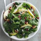 Add the spinach, pears, pomegranate seeds and walnuts to the bowl and toss gently to mix and coat well. Divide the salad among 4 plates or bowls and top each with about 1 Tbs. blue cheese. Serve immediately. Serves 4.