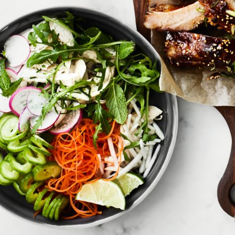 Full of fresh spiralized veggies and satisfying shredded chicken, this colorful main-course salad gets its bright flavor from a Southeast Asia–inspired dressing that combines fish sauce, lime juice and sesame oil. If you’re short on time, you can use purchased roast chicken instead of cooking your own.