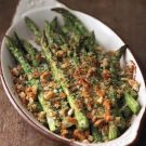 In a bowl, whisk together the cheese, bread crumbs, parsley, lemon zest, 1/2 tsp. salt and a grinding of pepper. Drizzle in the remaining 1 Tbs. olive oil and stir until well mixed. Sprinkle the bread crumb mixture over the asparagus. Bake, uncovered, until the asparagus is just tender and the topping is melted and golden brown, 15 minutes.