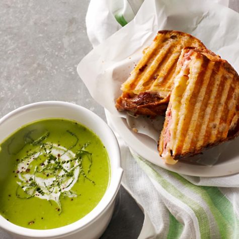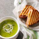 Pour the soup into bowls and garnish with crème fraîche and slivered mint. Serve the sandwiches alongside. Serves 4.