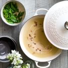 Leeks and potatoes are a classic combo for a simple spring soup that can be served hot or cold. Here we serve it hot and garnish it with peas, snow peas and chives, which look gorgeous against the pale soup, making this a stunning starter for your springtime table.