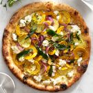 On a lightly floured surface, roll out and stretch one pizza dough ball into a 12-inch (30-cm) round. Transfer the dough to a lightly floured pizza peel. Arrange half each of the delicata squash and yellow squash slices on the dough, slightly overlapping them. Scatter half the onion slices over the squash, then sprinkle with half the goat cheese. Arrange a few sage leaves and thyme sprigs on top.