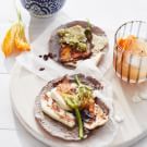 Squash blossoms signal the arrival of spring. Here, award-winning chef Diego Galicia combines these delicate flowers with panela to create quesadillas. A fresh Mexican cheese, panela becomes nicely caramelized when heated without losing its shape. His vibrant salsa made with tomatillos, serrano chiles and cilantro completes the dish. The salsa ingredients are first roasted on a stovetop grill pan until lightly charred to add a delicious smoky flavor.