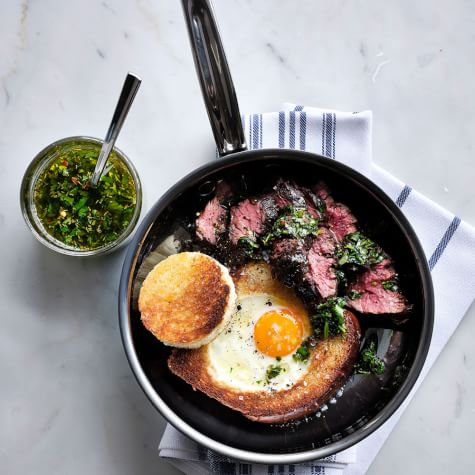 Full of fresh herbs, aromatic garlic and a bracing splash of vinegar, chimichurri is a popular condiment in Argentina, where it is typically spooned over grilled meats to add bright color and acidity. Here we use it to put a fresh spin on steak and eggs, perfect for a hearty weekend brunch. If you don’t have brioche, you can use slices of your favorite rustic country loaf instead. The recipe makes more chimichurri than you will need. Enjoy the leftovers spooned over grilled steak, chicken or vegetables, or dressed over salads. Or, if you’re serving a crowd, you can double the quantity of eggs and toast to serve four, using two separate fry pans.