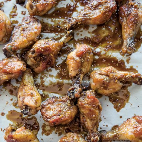 Remove the drumettes from the oven and brush the tops with the reduced marinade. Flip the drumettes over, brush the second sides with the marinade and sprinkle with the sesame seeds. Return to the oven and bake until the chicken is opaque throughout (no pink should show when you cut in next to a bone, and the chicken juices should run clear), about 10 minutes longer. Let cool slightly, then serve immediately. Serves 4.