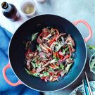 Return the steak to the wok. Add the lime juice and half of the soy sauce mixture and toss until warmed through. Garnish with basil and serve with the remaining sauce alongside. Serves 4.