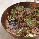 In a large wok or fry pan over medium-high heat, warm 1 Tbs. of the olive oil until very hot. Add half the beef, distributing it evenly, and cook without moving it for about 20 seconds. Continue to cook the beef, tossing and stirring it every 15 to 20 seconds, until browned but still slightly pink inside, 2 to 3 minutes more. Transfer to a platter. Repeat to cook the remaining beef in the remaining 1 Tbs. olive oil and transfer to the platter.