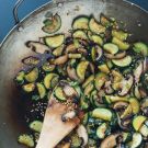 Return the wok to high heat and warm the remaining 1 Tbs. canola oil. Add the zucchini and stir-fry until golden brown and just tender, 7 to 8 minutes. Add the green onions and garlic and stir-fry until fragrant, about 1 minute.