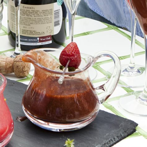 In a blender, combine the reduced balsamic vinegar, the 1 lb. strawberries, the lemon juice and the 6 Tbs. simple syrup and puree until smooth. You should have about 2 1/4 cups puree.