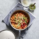 This pasta dish was inspired by an unforgettable meal that Williams Sonoma Test Kitchen Director Belle English ate in the small town of Usini, Sardegna. It gets a double dose of simple but flavorful sauce: First, it’s tossed with a tomato-based pomodoro sauce, then drizzled with fresh basil pesto. The recipe calls for a rustic cut of pasta called strozzapreti since it has an elongated, twisted shape that pairs well with hearty sauces. Then it’s finished with pecorino sardo, a lightly smoked Sardinian cheese made with milk from the island’s native sheep. If you can’t find either, substitute your favorite short noodle pasta and pecorino romano cheese.
