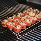 Remove the rack from the grill, turn the tomatoes over and stuff each half with about 1 Tbs. of the bacon-mushroom mixture. Place the rack over indirect heat, cover the grill, and cook until the tomatoes are tender and the stuffing is golden and crisp on top, about 15 minutes. Let cool for 5 minutes before serving. Makes 18 stuffed tomatoes.