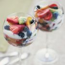 Ripe fresh fruits layered with yogurt in elegant balloon wineglasses make a deceptively simple dessert. Thyme and lemon zest add intriguing flavors to the seasonal mix of fruits, while honey encourages the fruits to release their juices.