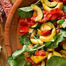 In a sauté/simmer pan over medium-high heat, warm the olive oil. Add the zucchini and squashes and cook, stirring occasionally, until browned and just tender, 5 to 6 minutes. Add the tomatoes and cook, stirring occasionally, for about 1 minute. Season with salt and pepper.