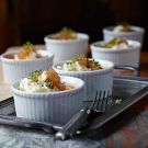 Spoon the sweet potato mixture into the prepared ramekins or baking dish. Bake until the potatoes are browned on top and barely jiggle in the center, 20 to 25 minutes for the ramekins and 40 to 50 minutes for the baking dish. Top each portion with scoop of Brebis cheese and apple-onion jam. Alternatively, top with about 1 Tbs. apple-onion jam and sprinkle with Singing Brook cheese. Serves 8.