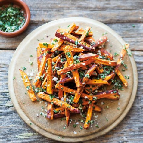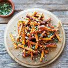 Anyone who likes classic French fries is guaranteed to like these cheese-and-herb-dusted sweet potato fries. They are roasted rather than deep-fried, which makes them healthier without sacrificing flavor. Leaving the peel on adds more taste and texture to the dish and also retains more nutrients.