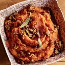 Melted butter seasoned with fresh sage, ground cinnamon, grated nutmeg and brown sugar give a flavor boost to these mashed sweet potatoes. Drizzle with the maple-pecan topping for a sweet crunch.