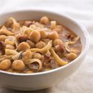This soup, called pasta e ceci in Italian, is a favorite dish of Romans. In Italy, it is served as a first course, but it is hearty enough to be enjoyed as a main dish. Because chickpeas are dense, they take a long time to soak and soften; here, baking soda is added to the soaking water to speed up the process.