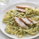 In a large pot over high heat, bring 5 quarts water to a rapid boil. Add the kosher salt and pasta and cover the pot. When the water returns to a boil, uncover and cook for about 5 seconds and then drain, reserving about 1/2 cup of the cooking water. Blend a few tablespoons of the cooking water into the pesto to make a creamy consistency, then add the pasta to the bowl and stir and toss with the pesto until the strands are well coated with the sauce, adding a little more of the cooking water if needed to loosen the sauce. Arrange the chicken slices on top of the pasta and serve immediately. Serves 4.