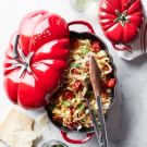 Spread the cherry tomatoes and garlic on a baking sheet in a single layer. Drizzle with the olive oil and season with salt and pepper. Roast until the tomatoes burst and are slightly charred, 20 to 25 minutes. Transfer the tomatoes and garlic to a large cast-iron pot off the heat.