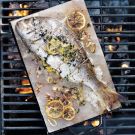 Drizzle the hot salt plank with olive oil; this will create a barrier that will prevent the fish from becoming too salty. Place the fish on the salt plank, cover the grill and cook 5 minutes. Using a fish spatula, gently turn the fish over and cook until the flesh flakes apart easily, about 5 minutes more. Transfer to a platter, remove the twine and drizzle with the herbed lemon oil. Serve immediately. Serves 2.