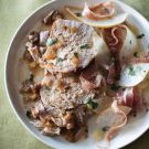 Tangy Braised Pork Loin with Pear and Prosciutto Salad