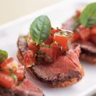 To assemble, place 1 or 2 slices of beef on a toasted baguette slice and top with 1 tsp. of tomatoes and a basil leaf. Arrange the canapés on a platter and serve. Serves 12 to 14.