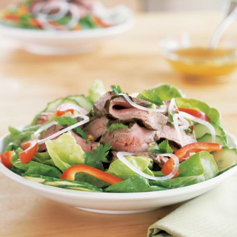 This dish, popular on Thai restaurant menus, is easy to prepare at home. Fish sauce is essential to creating a salad with authentic flavors. The low-fat vinaigrette and lean meat make it a healthful main-course meal.