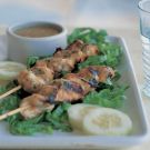 Divide the lettuce, cucumber slices and chicken skewers among 4 plates. Drizzle with some of the reserved sauce and serve immediately, passing the additional sauce at the table. Serves 4.