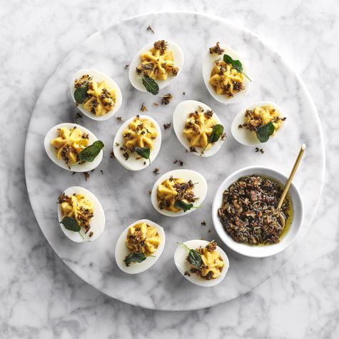 Pipe 12 small dollops of the filling, evenly spaced, on a serving platter; this will stabilize the deviled eggs so they won’t slide around on the platter. Place each egg white half on a dollop of filling, then pipe the remaining yolk mixture into the whites. Top each with a small spoonful of Thanksgiving Crunch and a fried sage leaf, then serve. Makes 12 deviled eggs.
