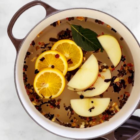 In a Dutch oven, combine the orange slices, apple slices, mulling spices, bay leaf, vanilla, peppercorns and cinnamon sticks, if using. Cover with the water and bring to a simmer over low heat. Continue to simmer, uncovered, for up to 2 hours.