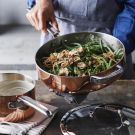 We gave the classic green bean casserole a delicious makeover. Sautéed cremini mushrooms and blanched green beans are combined with a luscious sauce of chicken stock and cream. Then the dish is topped with homemade fried shallot rings and baked until bubbling. If you prefer to serve it in a casserole dish, you can transfer the cooked green bean mixture to a buttered 9-by-13 inch (23-by-33-cm) baking dish before topping it with the fried shallots and baking as directed.
