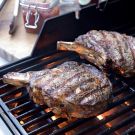 Transfer the steaks to a carving board, cover loosely with aluminum foil and let rest for 5 minutes. Cut away the rib bones and thickly slice the steaks. Season with salt and pepper and serve with caramelized onion jam. Serves 4.