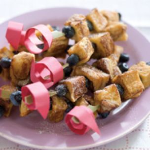 Whip up a few thick slices of French toast while the kids are getting ready. Cut the toast into cubes, and set them out with small skewers and fresh fruit. When they’re ready to eat, kids can load up the skewers however they like.