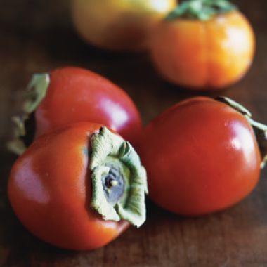 Persimmons are in peak season from late October to late February. Two basic varieties come to markets: the heart-shaped Hachiya that must soften completely before losing its astringency and the smaller, rounder Fuyu that can be enjoyed while still firm. Crisp and sweet, Fuyu persimmons pair well with darker salad greens such as spinach, frisee, and endive. Though they require long ripening at room temperature, Hachiya persimmons reward the patient cook with a rich, sweet flavor that epitomizes the harvest season. They are delicious in cakes, puddings, quick breads, and ice creams.