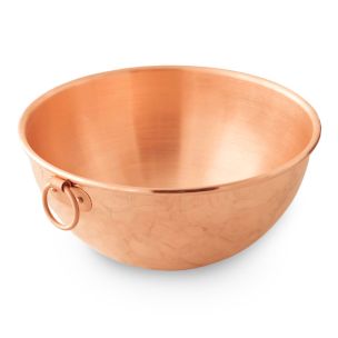 Copper bowls, unlike copper cookware, are typically made of solid unlined copper; professional chefs most often use bowls like these to whip egg whites to frothy peaks. Copper is the ideal material for this task as it reacts naturally with the whites, making them more stable when beaten so they almost triple in volume.