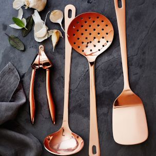 Some kitchen tools, such as some serving spoons and spatulas, although copper colored, are not actually made of copper at all. Instead, they are made from stainless steel with copper-colored titanium plating, which does not tarnish. Check the manufacturer’s instructions for care, but most of these items are dishwasher safe.
