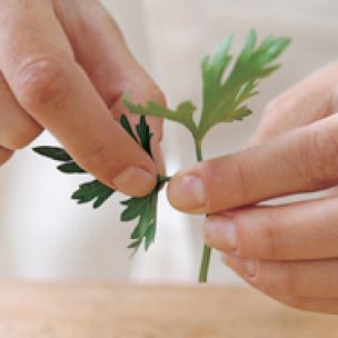 Rinse the herbs and pat dry. For herbs like parsley or cilantro, remove the leaves from the stems by plucking them one at a time.