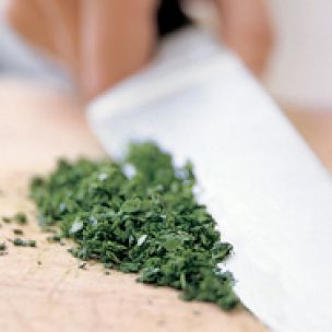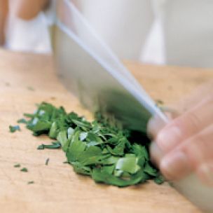 Gather the leaves on a cutting board. Rest the fingertips of one hand on the tip of a chef’s knife and rock the blade back and forth briefly over the leaves to coarsely chop them.