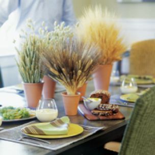 Create an autumn harvest centerpiece with sprays of dried wheat and grasses such as rice stalks and lavender in simple terra-cotta flowerpots. Offer each guest a pot to take home at the end of the meal.