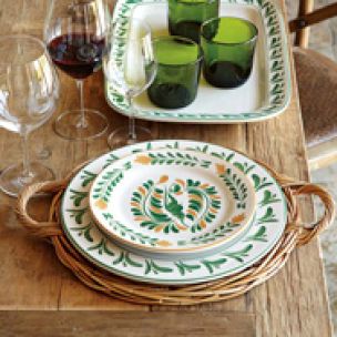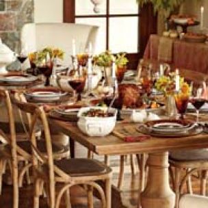 Chargers with a natural texture and neutral color are perfect for an informal Thanksgiving table. Select a simple runner, laid over the bare tabletop, to complete the style.