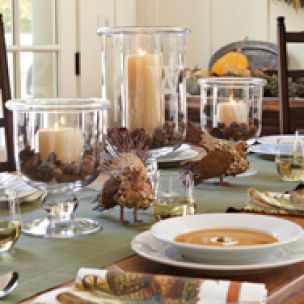 Display candles in glass hurricanes filled with classic autumn motifs such as acorns and pine cones. Alternatively, select candlesticks with rustic textures to complement the setting.