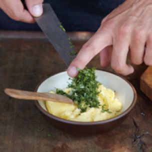 Compound butter is a mixture chopped fresh herb and softened butter. A small pat of this flavored butter adds inimitable flavor and moisture as it melts on beef, chicken, pork and fish. Try our favorite recipe on your next grilled steak or on steamed vegetables.