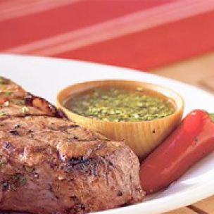 A savory condiment of Argentina, chimichurri plays a culinary role similar to that of ketchup in the United States. There are many versions of chimichurri, but the primary ingredients are always fresh herbs, spicy chili, oil and vinegar, with a texture ranging from smooth to salsalike. This piquant sauce is delicious paired with grilled steak.