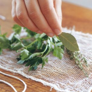 A bouquet garni imparts subtle herbal flavor to soups and stews. Rinse and wring out a 10-inch square of cheesecloth. Spread out the damp cheesecloth on a work surface and place the herbs or spices in the middle. Bring the four corners of the cheesecloth together and tie them with a length of kitchen string, forming a secure bundle with no gaps. Use the bouquet garni as directed in your recipe.