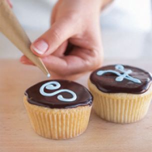 MONOGRAMS Pipe monograms onto glazed cupcakes to create personalized cupcakes. When piping monograms, exaggerated curls and swirls make plain lettering look grand and festive. (If you think you have an unsteady hand, practice first on a plate or baking sheet. Unlike frosting, piped glaze cannot be reused because it dries as it sits.)