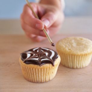 SPIDER WEBS To make a spider web, pipe concentric circles onto a glazed cupcake. Lightly draw the tip of a wooden skewer, toothpick, or paring knife from the center of the cupcake outward to the edge, occasionally alternating the direction, if you choose. For the cleanest look, wipe the tip of the skewer after each draw.