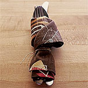 Roll a napkin—after first folding it in half—around the flatware. Tie the bundle with natural twine or raffia. Turn down one corner of the napkin and tuck it under the twine.