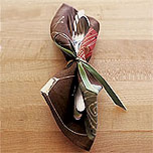 Bundling flatware in a napkin adds style to a casual meal, especially one that is not served at a set table. Choose one of these three easy ideas and arrange the assembled bundles on a tray the night before.