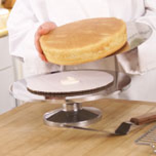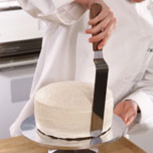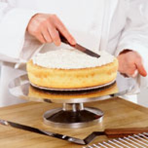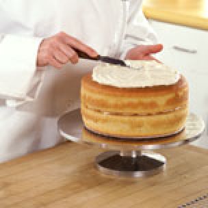 1. Set a cardboard cake round sized to fit the cake on a cake-decorating stand. Put 1 Tbs. icing in the center of the cardboard round, then center the first layer of cake on the round.