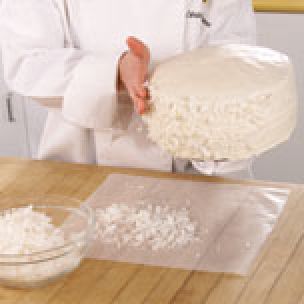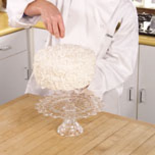 5. To decorate the cake with flaked coconut, ground nuts or chocolate shavings, carefully remove the cake from the stand, holding the cake by the cardboard underneath. Over a sheet of waxed paper, gently press the coconut or other garnish into the sides, letting the excess fall off.